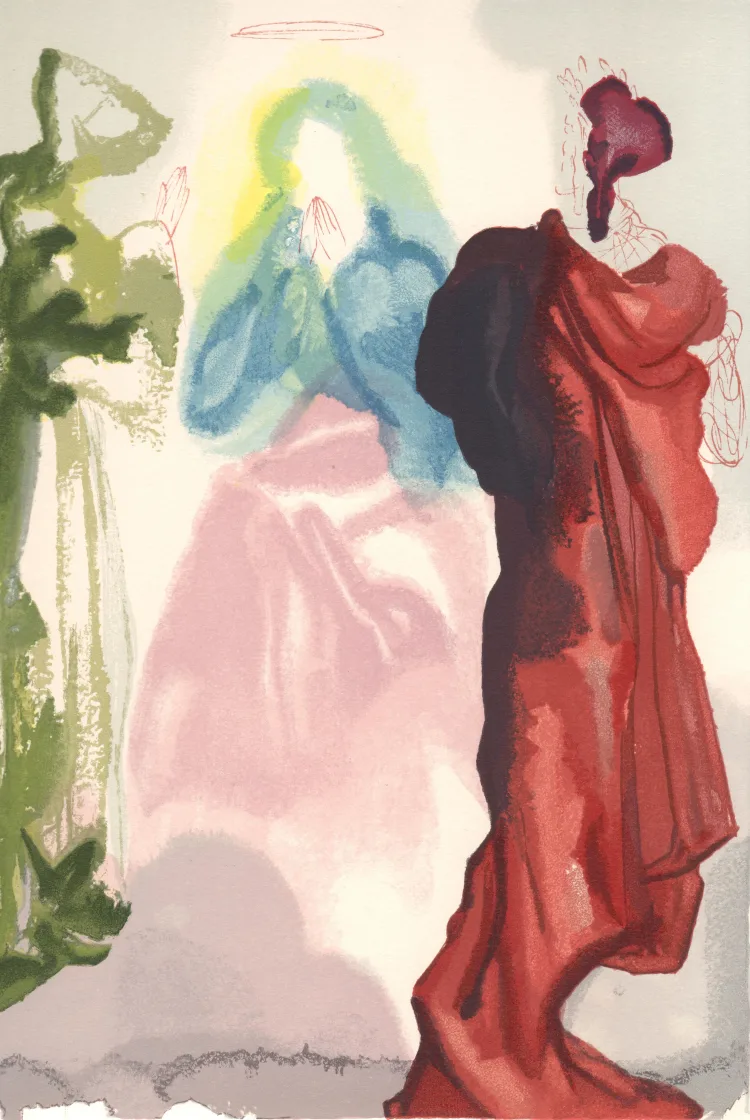 Dalí’s response to Dante’s vivid descriptions of Heaven, Hell, and Purgatory was a series of 100 striking watercolors, each a testament to his extraordinary ability to translate the ethereal and abstract into stunning visual form. This project was not just an artistic endeavor but also a technical marvel. Under Dalí’s meticulous guidance, these watercolors were skillfully transformed into wood engravings, utilizing an astounding 3,500 blocks. This intricate process, a blend of artistic vision and technical prowess, spanned nearly five years.