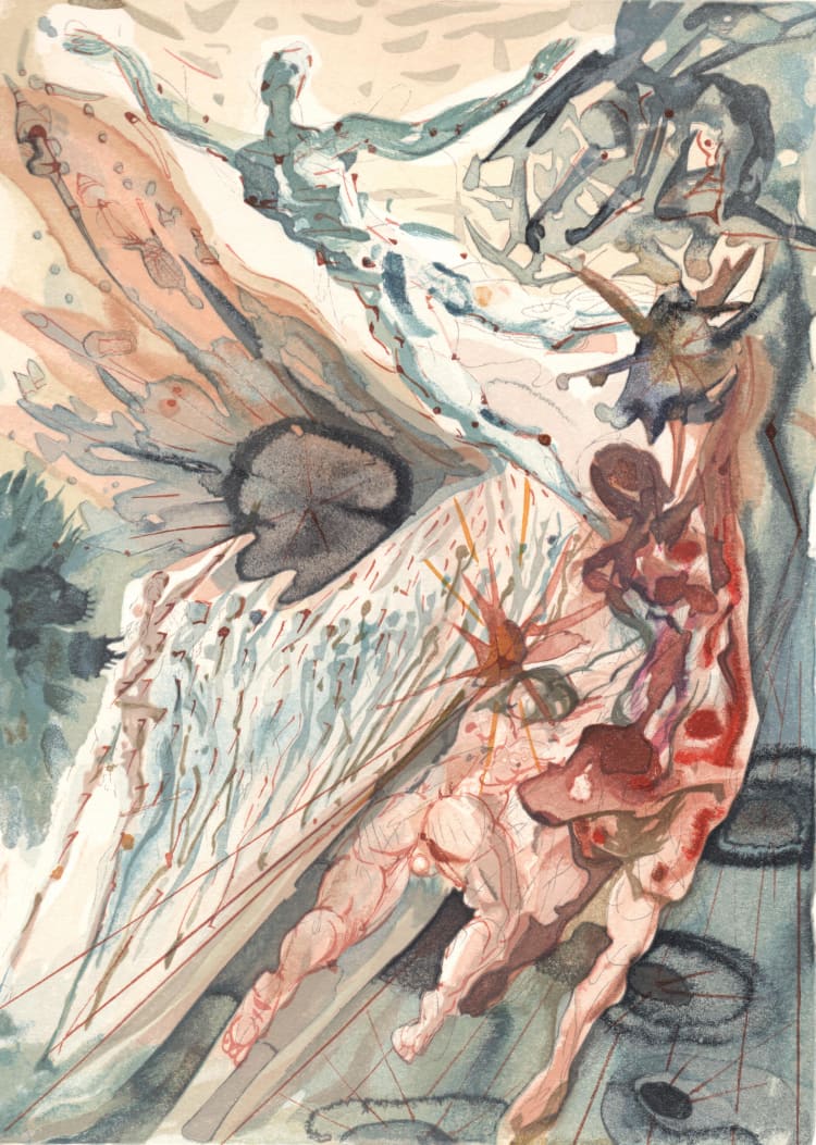 Purgatorio – Canto 26, MEETING OF THE TWO GROUPS OF LECHERS” Dalí’s depiction of Canto 26 focuses on the poet Guido Guinizzelli. The piece conveys the respect and admiration between Dante and Guinizzelli, rendered in a surreal style that highlights the enduring impact of Guinizzelli’s poetic contributions.