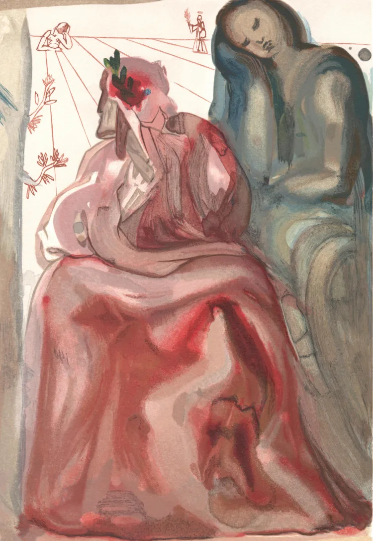 Purgatorio – Canto 31, DANTE’S CONFESSION” This piece for Canto 31 shows the Garden of Eden in its pristine glory. Dalí’s surrealistic approach brings a dreamlike quality to the garden, symbolizing the purity and peace of this ultimate earthly paradise, as experienced by Dante..